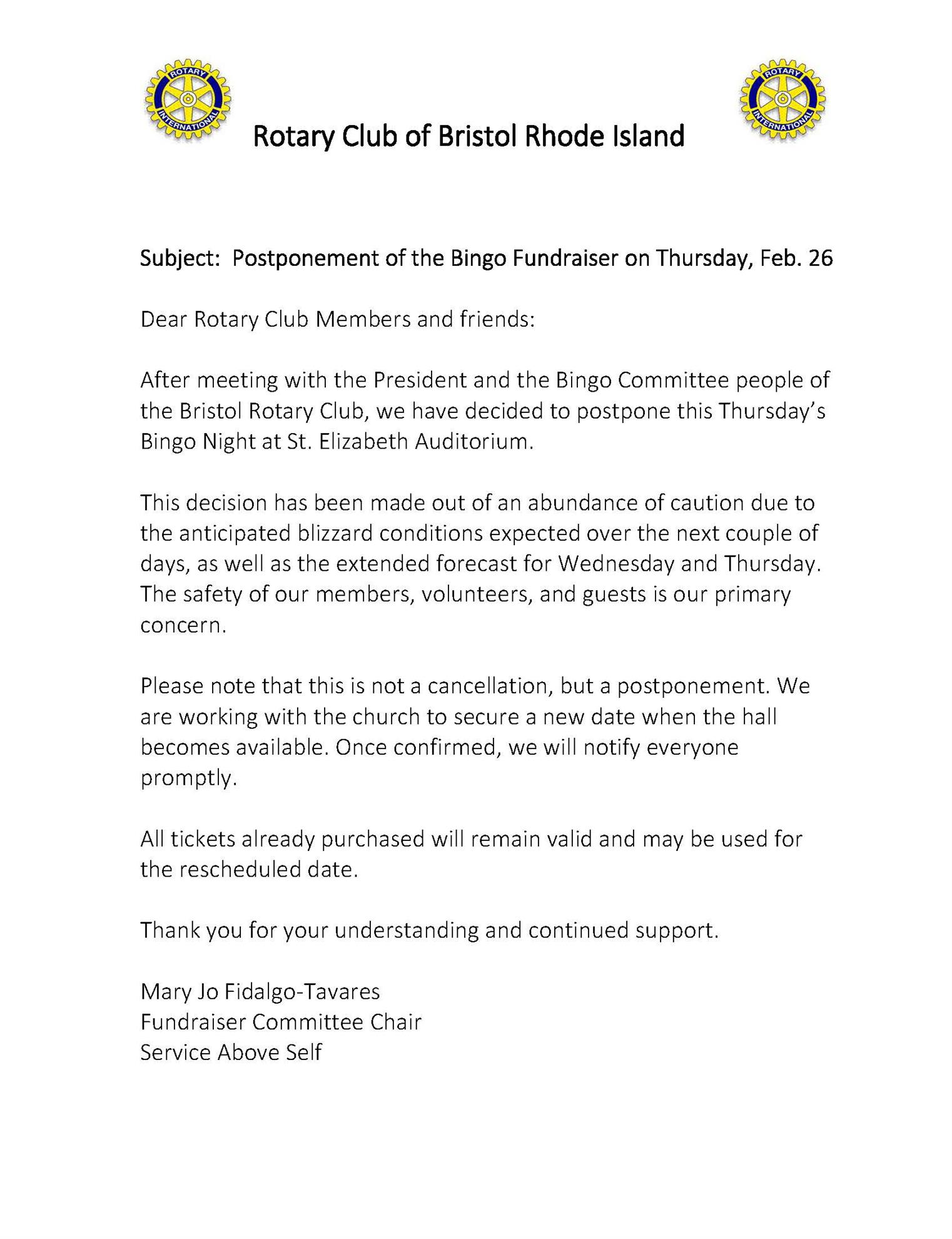 Postponement of Bingo Night 2/26/2026